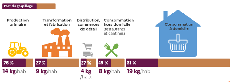 La répartition de ces 55 kg du gaspillage alimentaire sur la chaine alimentaire est :